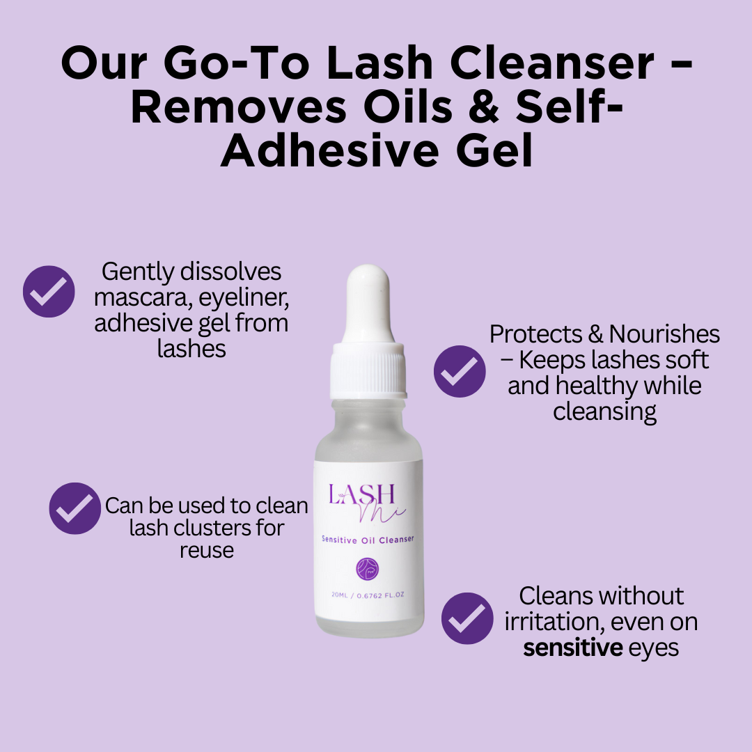 Our Sensitive Cleansing Oil is specially formulated for sensitive skin, providing a gentle yet effective cleanse for your natural lashes. Removes any leftover sticky residue from the self-adhesive gel, leaving your lashes clean and fresh for the next application.